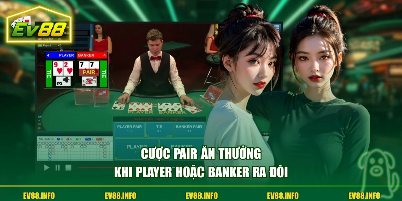 Player Pair, Banker Pair Live Baccarat là cửa 2 quân đầu P/B tạo thành đôi (cùng số). Tỷ lệ thưởng 1:11 nghĩa là đặt 10K trúng nhận 110K lời cộng vốn. Xác suất khoảng 7.47% cho mỗi bên, khó hơn cửa chính nhưng dễ hơn Tie.